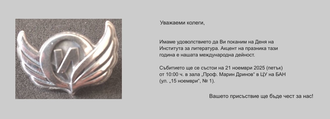 Срещата ще се проведе в Конферентна зала на 9. етаж на Института за литература на 30.04 (сряда) от 12:00 часа (бул. „Шипченски проход“ 52, бл. 17).